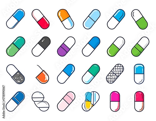 pill, icon, colourful, medicine, capsule, health, drug, pharmacy, medicals, graphic, design, illustration, simple, flat, various, vibrant, shape, style, element, treatment, health care, digital, vector