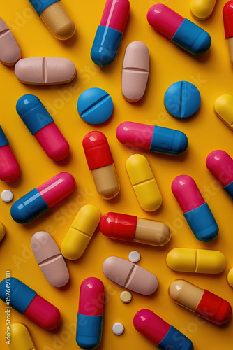 Colorful pills and capsules on a yellow background. Abstract health care and pharmaceutical concept. Medication top view.