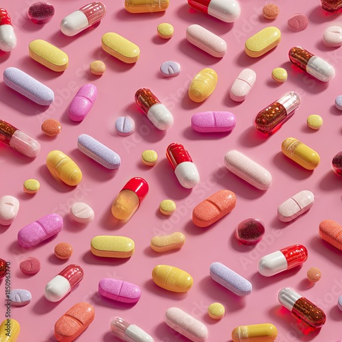 Colorful pills and capsules randomly spread across a vibrant pink surface