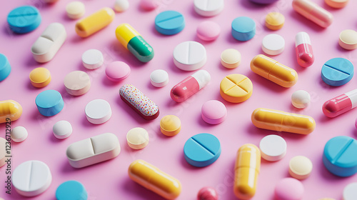 Colorful pills and tablets of various shapes and sizes scattered on a pastel colored background. Medical and pharmaceutical concept