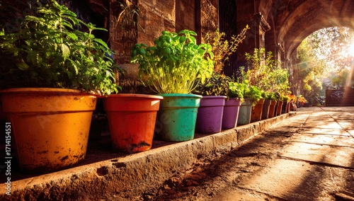 herb, pot, colourful, plant, sunlight, paseo, pathway, terracotta, garden, urban, sunbeam, vintage, brown, green, red, blue, yellow, purple, nature, growth, bloom, foliage, vibrant, fresh, bright, warm, sunny, stone, pavement, architecture, historical, old, ancient, exterior, detail, perspective, long, row, line, closeup, shallow, depth, sharpened, light, shadow, rustic, decorative