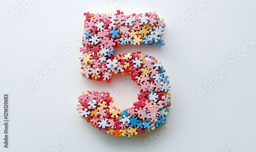 Colorful puzzle pieces forming '5' on white background