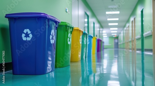 Colorful recycling bins lined up in a clean, green hallway, promoting waste segregation and environmental responsibility.