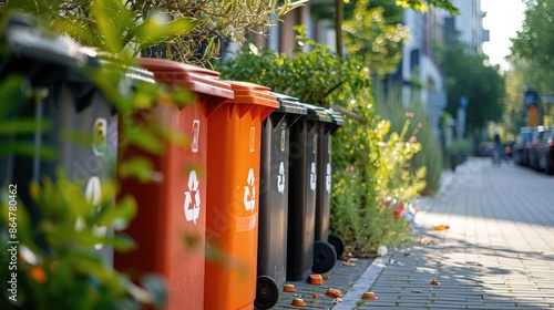Colorful recycling bins lined up on a residential street, promoting waste separation and environmental sustainability in urban areas.