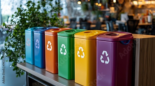 Colorful recycling bins with the recycle symbol in a restaurant highlight the importance of waste management in public spaces.