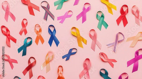 Colorful ribbons representing cancer awareness displayed on a soft pink background. These vibrant ribbons symbolize support for different cancers, promoting solidarity and hope in the fight against ca