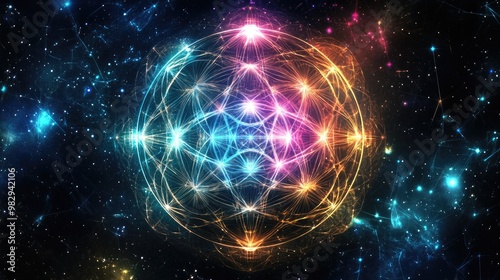 Colorful round sacred geometry symbol with glowing stars set against a backdrop of black white and blue Suitable for logo game cover or card designs