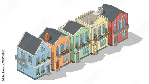 Colorful row houses, isometric vector illustration of residential architecture with townhouse facade design