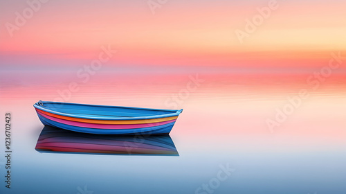 Colorful rowboat on calm sea at sunset; peaceful scene for travel brochures