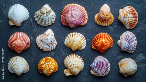 Colorful Seashells on Dark Stone Background