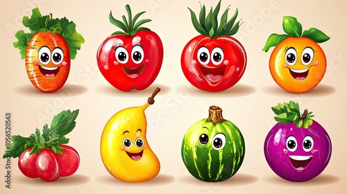 Colorful set of cartoon vegetables and fruits with charming faces, conveying playfulness and healthy eating for kids.