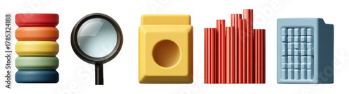 illustration, shape, colours, object, set, theme, isolated, transparent, background, circle, square, rectangle, cylinder, tool, toy, educational, stacked, magnifying, search, container, bar, design, plastic, playful, creative, decorative, bright, vibrant, modern, art, style, fun, children, learning, geometry, study, visualisation, arrangement, spacial, dynamic, grouping, perspective