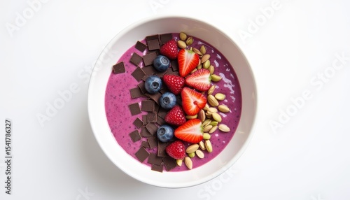 Colorful Smoothie Bowl with Berries, Nuts, and Dark Chocolate Chunks on White Background
