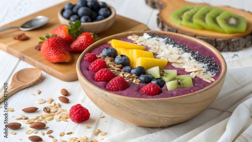 smoothie, bowl, fruit, healthy, refreshing, lighting, wellness, presentation, pleasure, health, nourishment, life, still, mineral, vitamin, indulgence, well-being, treat, ingredient, energy, fiber, seasonal, vibrant, promoting, studio, kiwi, arrangement, seed, mango, coconut, lifestyle, spoon, antioxidant, overhead, tropical, berry, colourful, receipe, nourishment, wood, preparation, granola, eating, composition, culinary, bright, vegan