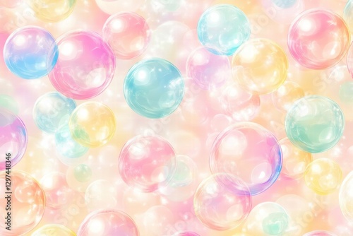 Colorful soap bubbles create a cheerful pattern in a soft pastel background filled with vibrant hues of blue, pink, and yellow. Generative AI