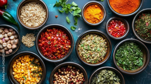 spice, herb, ceramic, bowl, colourful, seasoning, topview, turmeric, chili, salt, cooking, favor, kitchen, ingredient, food, organic, culinary, composition, natural