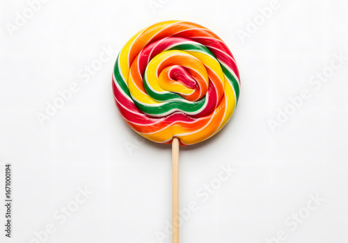 lollipop, candy, sweet, confectionery, colourful, red, orange, yellow, green, blue, spiral, swirl, treat, dessert, food, sweetness, isolated, stick, wooden, white, background, overhead, close, up, studio, photo, image, sweet, delicious