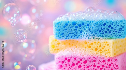 Colorful sponges stacked playfully with bubbles reflecting a joyful atmosphere in a bright, cheerful setting