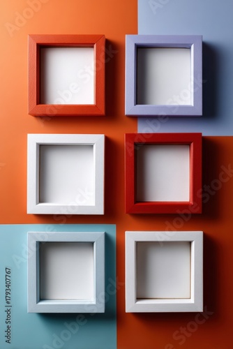 frame, colourful, square, geometric, background, red, orange, blue, white, purple, artistic, design, modern, decor, symmetric, empty, pattern, arrangement, wall, minimalistic, vibrant, style, art, exhibition, display, interior, space, blank, gallery, visual, decoration, decorative, contemporary, alignment, contrast, composition, home, abstract, aesthetic, order, neat, clean, structured, simplicity, elegance, edgy, precise, balance
