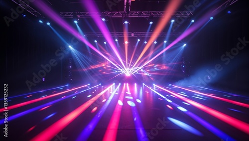 Colorful stage lights illuminate an event space during a live performance in a vibrant atmosphere