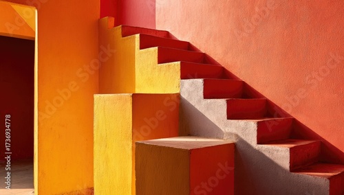 staircase, step, interior, architecture, building, concrete, colourful, red, yellow, orange, light, shadow, geometric, modern, design, bright, exterior, wall, pattern, block, cubed, structure, perspective, bold, vibrant, dynamic, sunlight, colours, contrast, elevation, space, form, texture, detail, modernism, warm, high-coloured, sunny, sunlit, architectural