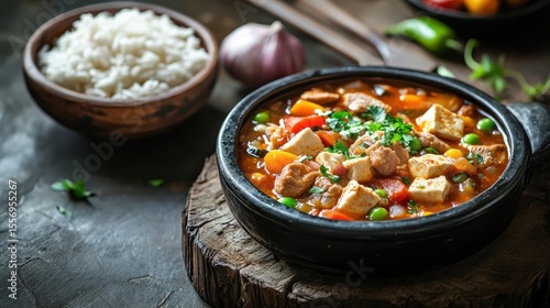 Colorful Stew with Chicken, Vegetables, and Rice in a Rustic Setting