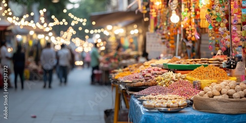 Colorful street market with vibrant stalls displaying various goods in an outdoor setting, illuminated by warm, decorative lights.