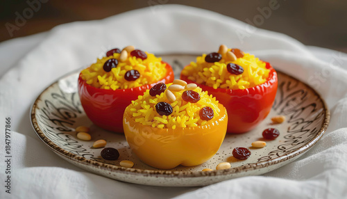 Colorful stuffed peppers with rice, nuts, and dried fruits on a decorative plate Generative AI