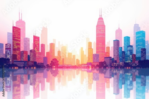 urban, metropolis, downtown, architecture, building, skyscraper, modern, futuristic, vibrant, rainbow, many-coloured, gradient, silhouette, skyline, city landscape, panorama, horizon, dusk, twilight, evening, waterfront, river, lake, mirrored, symmetry, abstract, artistic, graphic, illustration, vector, design, digital, art, wallpaper, background, poster, print, tour tourism, travel, business, finance, technology, innovation