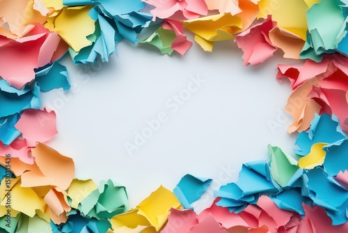 Colorful torn paper pieces framing a blank space, suitable for creative design and art projects