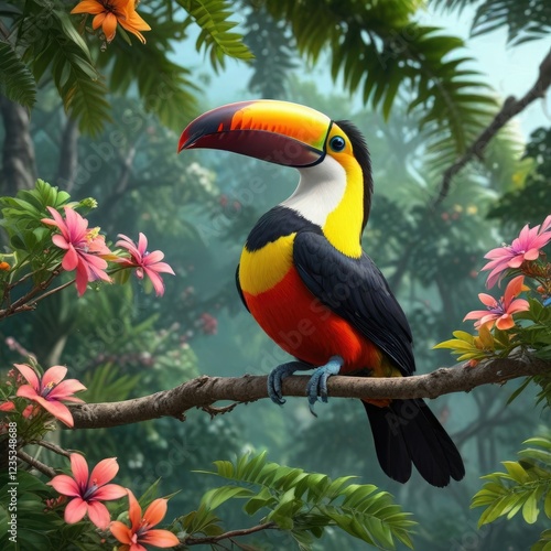 Colorful toucan bird in tree top with leaves and flowers, birdsong, outdoor landscape, colorful plumage