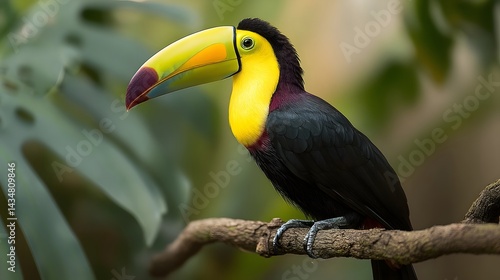 Colorful toucan resting on a branch, lush greenery behind, showcasing nature's vibrant beauty.