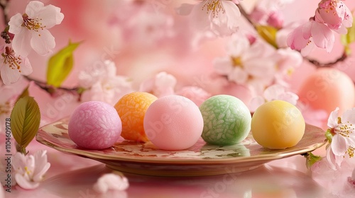Colorful Traditional Asian Desserts with Cherry Blossoms Background