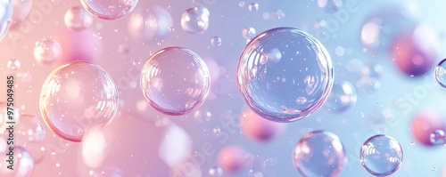Colorful transparent bubbles floating against a soft pastel gradient background creating a whimsical and dreamy atmosphere