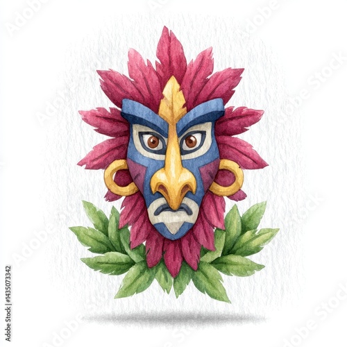 mask, tribal, illustration, stylised, colourful, flower, leaf, red, purple, green, gold, textured, white, background, face, serious, expression, art, design, graphic, cultural, traditional, pattern, texture, watercolor, painting, digital, artwork, image, vector, fantasy, mythology, ancient, spiritual, symbol, decoration, exotic, vibrant, decorative, element, isolated, design element, ethnic