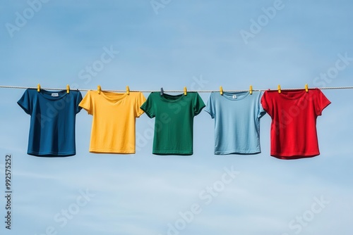 Colorful T-shirts hanging on a clothesline against a clear blue sky. Bright and vibrant colors create a cheerful atmosphere, showcasing casual wear in an outdoor setting.