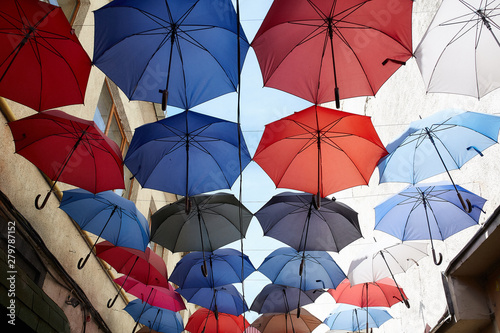 colorful umbrellas against the sky between the houses, beautiful umbrellas