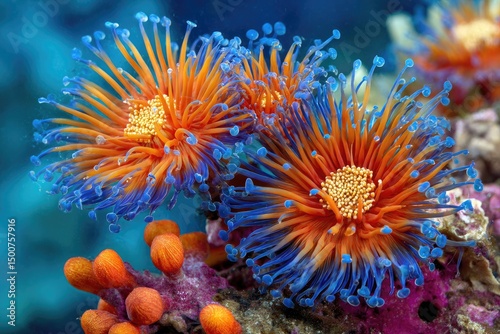 underwater, coral, coral reef, anemone, sea anemone, ocean, marine life, aquatic, blue, orange, purple, marin, nature, colourful, vibrant, ecosystem, wildlife, invertebrate, sea, water, ocean floor, ocean floor, plant, botanical, flora, beauty, detail, closeup, macro, photo, artistic, decorative, biology, zoology, science, environment, conservation, peaceful, serene, tranquil, ocean life, ocean life, life