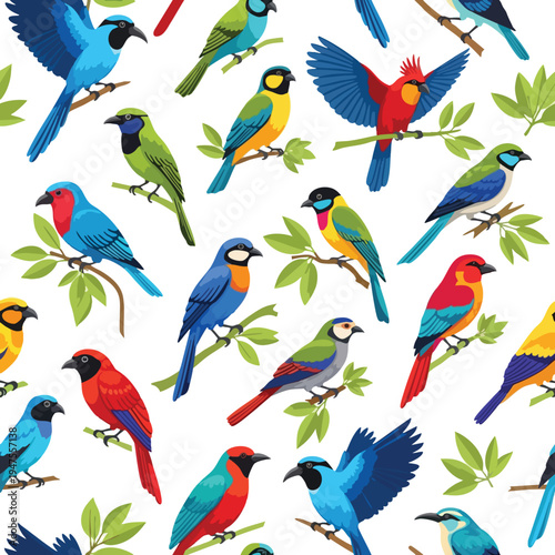 bird, colourful, avian, tree branch, leaf, nature, tropical, vibrant, exotic, wing, feather, beak, eye, plumage, blue, red, yellow, green, black, orange, turquoise, pink, white, fauna, wildlife, forest, tree, garden, illustration, pattern, repeat, graphic, design, art, creative, image, background, summer, spring, delicate, small, detailed, lively, cheerful, bright, playful, songbird