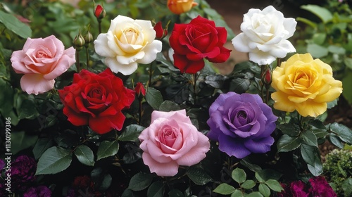 Colorful variety of roses blooming in a lush flowerbed showcasing vibrant shades of red, white, yellow, purple, and pink with rich fragrance.