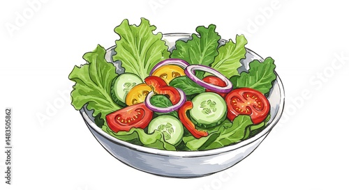 salad, vegetable, food, healthy, diet, tomatoes, cucumber, onion, bell pepper, lettuce, dish, bowl, plate, fresh, healthy eating, nourishment, colourful, vegetarian, vegan, illustration, drawing, hand-drawn, isolated, graphic, art, food photography, delicious, appetising, health food, fresh food, summer, spring, diet food