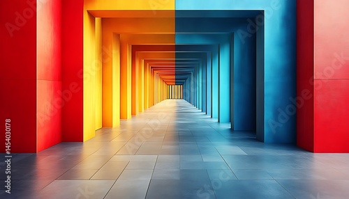 hallway, perspective, corridor, vibrant, colourful, architectural, design, interior, space, modern, geometric, structure, tunnel, red, yellow, orange, blue, colours, pattern, light, dark, grey, floor, wall, panel, column, empty, long, wide, abstract, contemporary, vision, futuristic, bright, high-coloured, shadow, texture, art