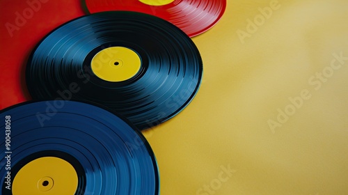 Colorful Vinyl Records Displayed on a Bright Yellow Background