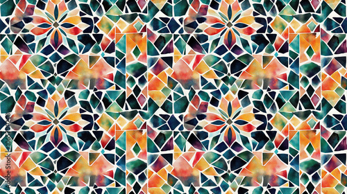 Colorful watercolor tile mosaic pattern featuring geometric shapes with ethnic designs for versatile backgrounds and textile applications