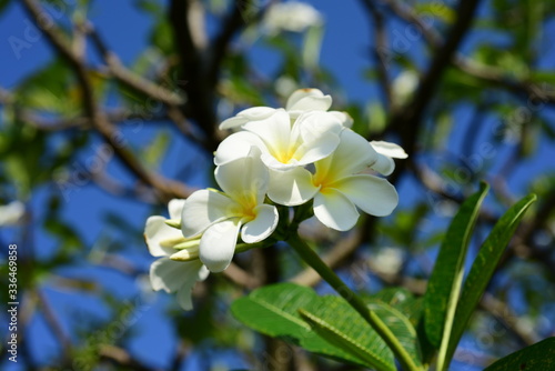 Colorful white flowers in the garden. Plumeria flower blooming.