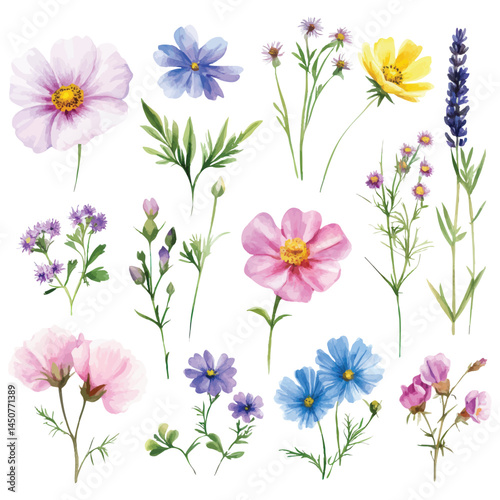 Colorful Wildflowers Watercolor Collection with Pink, Blue, Yellow and Purple Flowers on White Background for Botanical Designs