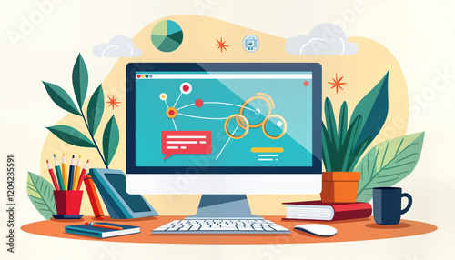computer, screen, educational, content, learning, study, tool, resource, desk, environment, workspace, pen, book, cup, hot drink, bright, graphic, creativity, technology, cognition, online, inspiration, idea, productivity, software, symbol, illustration, organisation, item, colourful, arrangement, teaching, digital, research, note, planning, session, information, interaction, exploration, design, academic, student, space, productive, tool