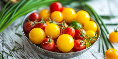 Colorful yellow and red tomatoes accompanied by fresh green chives are displayed in a metal bowl on a rustic white wooden table, showcasing healthy nutrition on a bright sunny day.