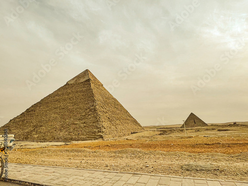 Colossal pyramids rise from the desert landscape Giza Pyramids, Egypt, ancient, historic, landmark, architecture, scenic, travel, tourism, spiritual, heritage, cultural, design, ornate, carving, stone