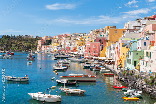 Colourful houses and boats at Marina Corricella, Procida island, Naples bay, Naples province, Phlegraean islands, Campania region